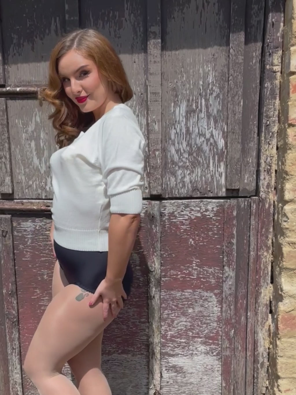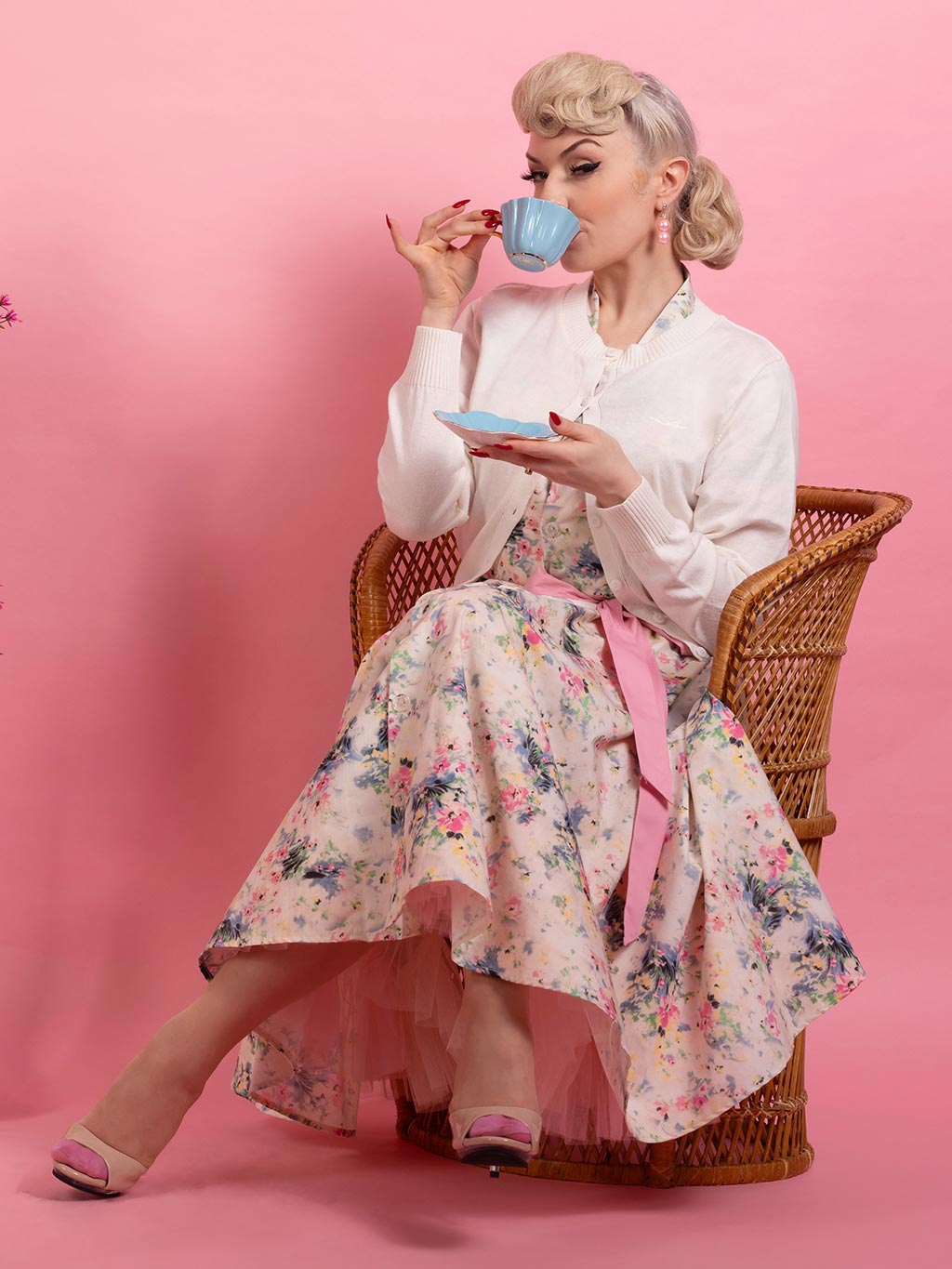 Our meticulously crafted knitwear, including cardigans and jumpers made in the UK from luxurious cotton-acrylic blends, captures the essence of the iconic "sweater girl" silhouette.