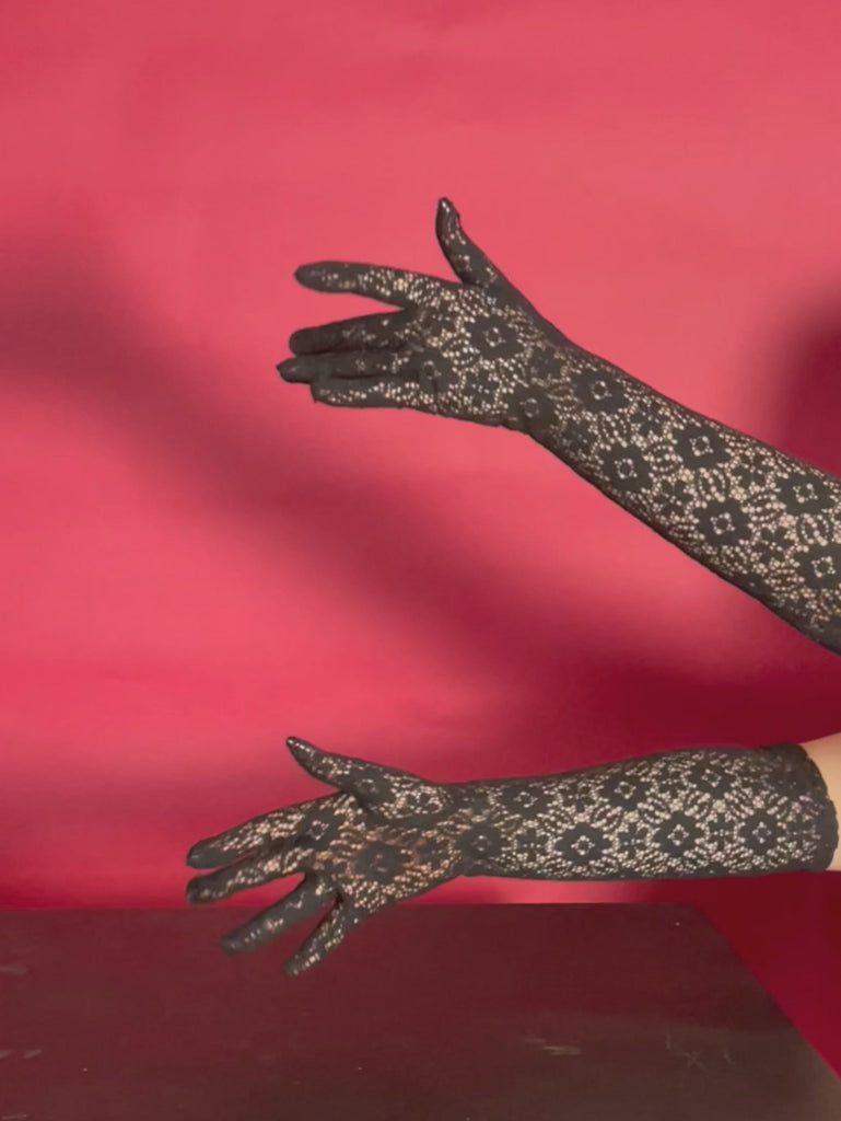 The delicate floral pattern adds a subtle touch of drama, while the stretchy nylon-elastane blend ensures a comfortable fit for all hand sizes. Designed to sit just below the elbow, they measure approximately 46cm from fingertip to cuff and can be worn at full length for a refined look or gently ruched down for a vintage, bracelet-length style.